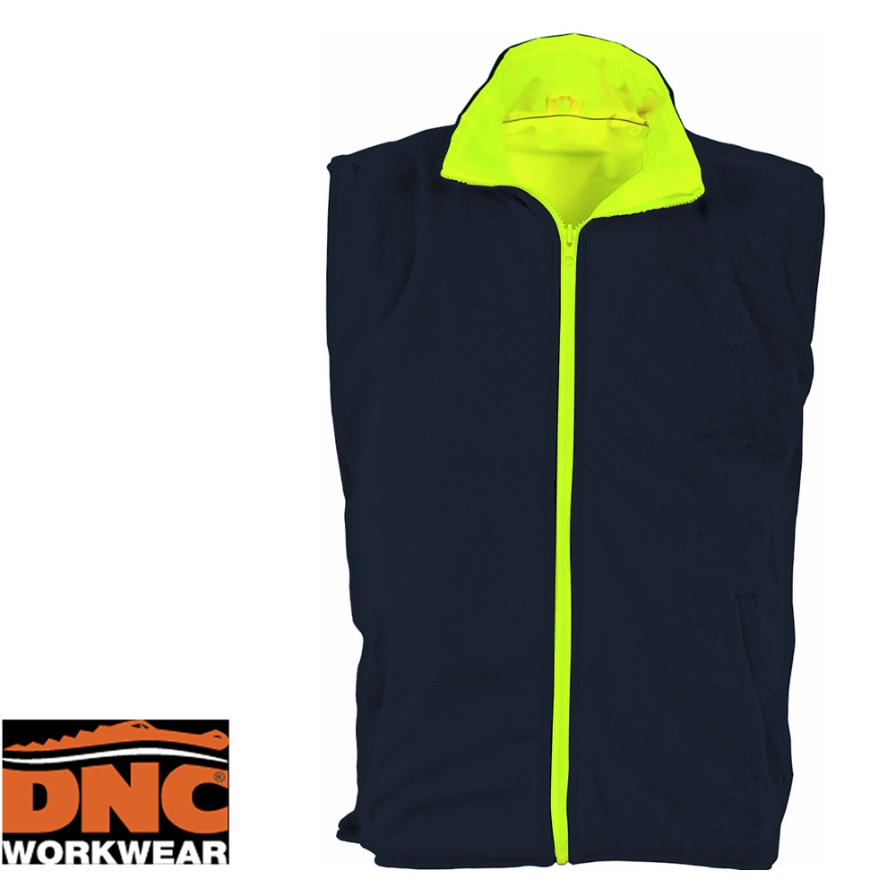 DNC Hi Visability Yellow / Navy reversible vest with 3M reflective tape. Features breathable polyester shell, two side pockets. Reversible polar inner fleece with access for embroidery.
