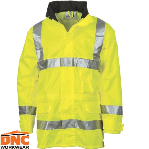 The DNC Workwear Hi-Vis Breathable Rain Jacket with 3M Reflective Tape is created from heavy duty waterproof polyester, 300D. The jacket features 2 flap side pockets, mesh lining and a foldaway hood. The storm cuffs, adjustable sleeve tabs and 3/4 length create the most efficient and convenient jacket rain jacket.