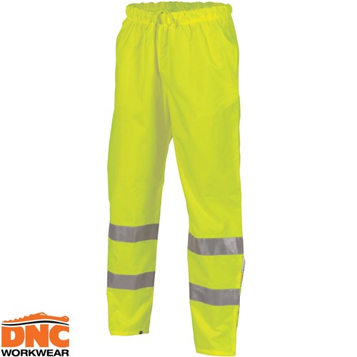 The DNC Workwear Hi-Vis Breathable Rain Pants with 3m Reflective Tape is created from heavy duty breathable polyester, 300D semi-sealed. The waterproof pants feature 2 flap side pockets, mesh lining, an elastic drawstring waist and press stud closures.