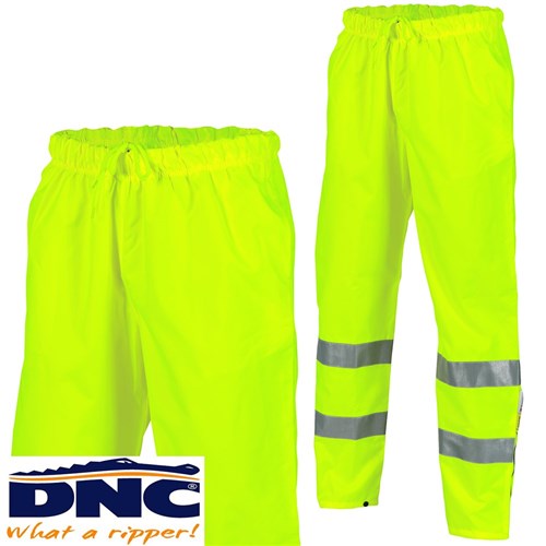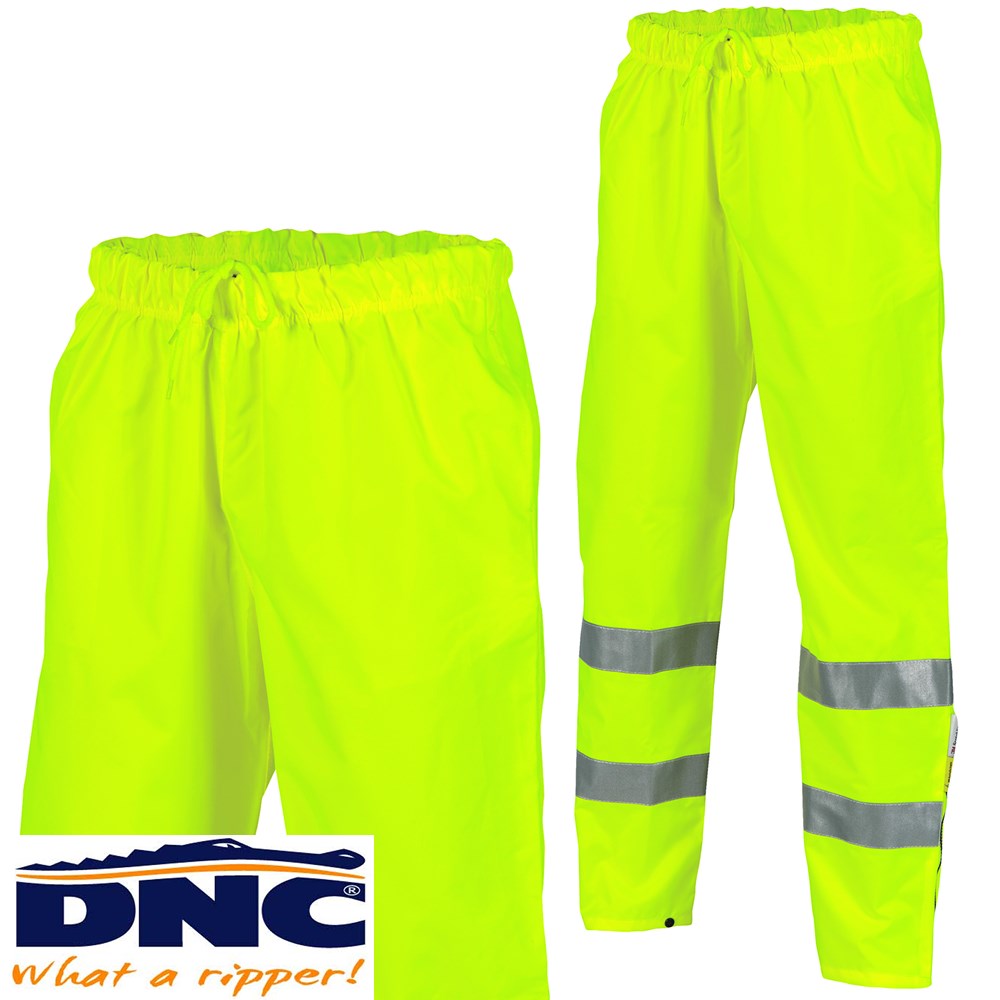 DNC Hi Vis Breathable Rain Pants with 3M reflective tape,Yellow. These Rain Pants features a waterproof outer shell, 2 flap side pockets, mesh lining, elastic drawstring waist with leg zippers, press stud closure and 3M 8906 Reflective Tape. Made from 300D heavy duty Polyester/PU, seam sealed.