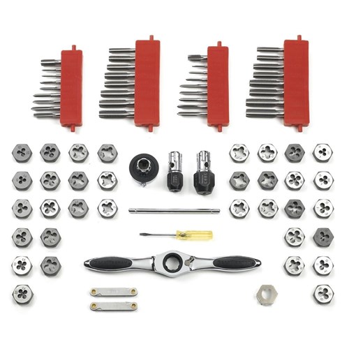 This top quality GearWrench Combination Tap & Die 75 Pieceset supplied in a sturdy case includes a medium Tap and Die ratcheting T wrench, small and medium tap adaptors, sliding T for adaptors, medium Hex Die Adaptor, SAE and Metric screw pitch gauge and a number 5 screwdriver. 34 Taps, Metric 3mm to 12mm, Imperial 1/4 to 1/2, Gauge 4-12, NPT 1/8 and BSP 1/8. 34 Dies, Metric 3mm to 12mm, Imperial 1/4 to 1/2, Gauge 4-14, NPT 1/8 and BSP 1/8.