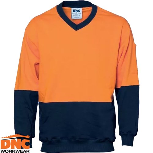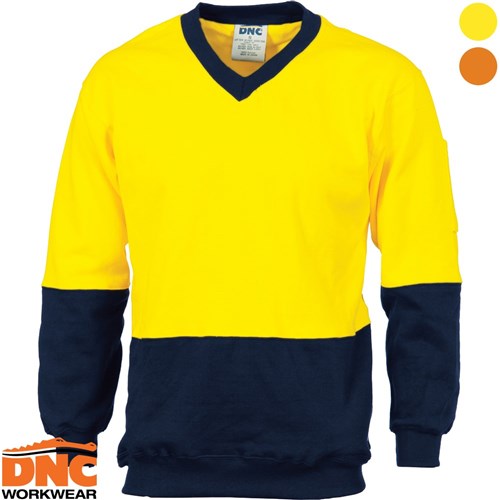 The DNC Workwear Hi-vis Two Tone Cotton Fleecy Sweat Shirt V-Neck is created from 100% Cotton Fleece, 300 gsm. The Sweat Shirt is designed with electrical protection and features side zip pockets, a sleeve pen pocket and a navy detailing on the front and back.