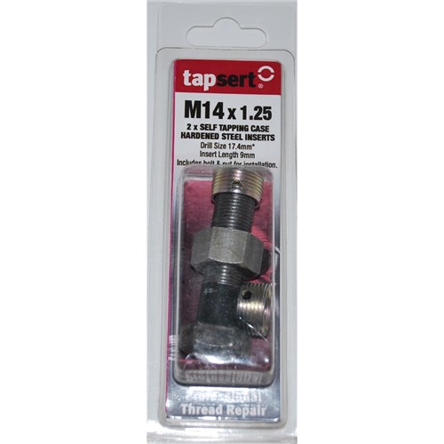 This M14x1.25 threaded, tapered sleeve insert can be used to repair damaged threads in any application where wall thickness is not an issue. Once the damaged thread has been drilled out to recommended size (drill not supplied) the insert should be wound onto the supplied bolt and locked in place using the supplied nut. insert sleeve into the hole (tapered end first), then proceed to wind insert and bolt into place (insert will cut thread). when insert is in place loosen nut and remove bolt to reveal repaired thread.