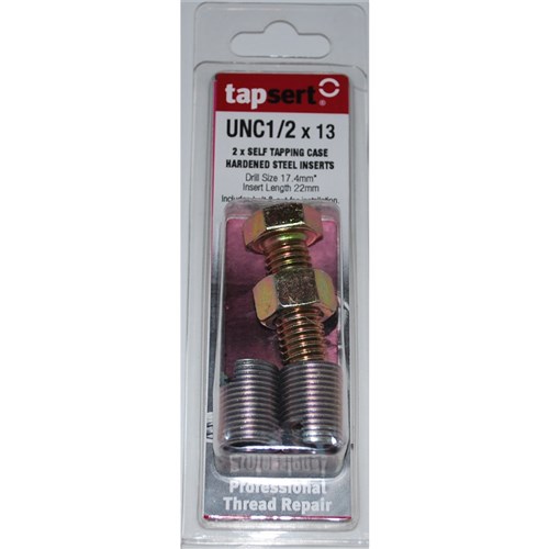 This 1/2" UNC threaded, tapered sleeve insert can be used to repair damaged threads in any application where wall thickness is not an issue. Once the damaged thread has been drilled out to recommended size (drill not supplied) the insert should be wound onto the supplied bolt and locked in place using the supplied nut. insert sleeve into the hole (tapered end first), then proceed to wind insert and bolt into place (insert will cut thread). when insert is in place loosen nut and remove bolt to reveal repaired thread.