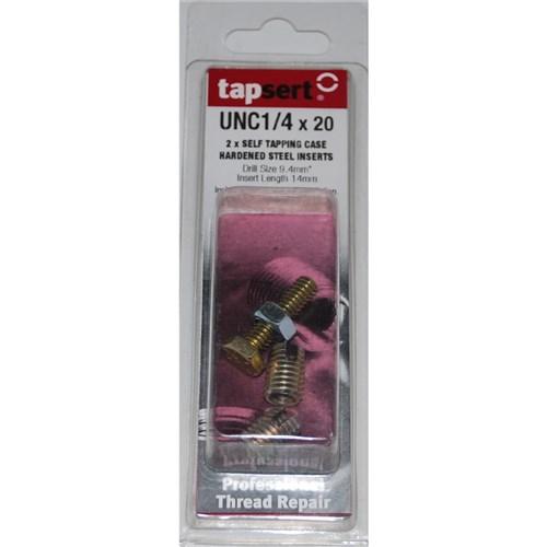 This 1/4" UNC threaded, tapered sleeve insert can be used to repair damaged threads in any application where wall thickness is not an issue. Once the damaged thread has been drilled out to recommended size (drill not supplied) the insert should be wound onto the supplied bolt and locked in place using the supplied nut. insert sleeve into the hole (tapered end first), then proceed to wind insert and bolt into place (insert will cut thread). when insert is in place loosen nut and remove bolt to reveal repaired thread.