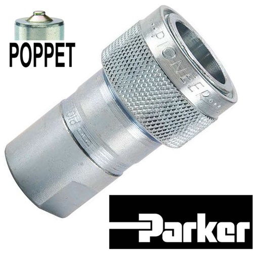 Parker 4000 series general purpose hydraulic quick coupling. Accepts ISO 5675 (1/2 size) nipples. Protective zinc plating. Rated flow 12 USGPM and 3000 PSI. Nitrile seals. Manual sleeve with ball valve.