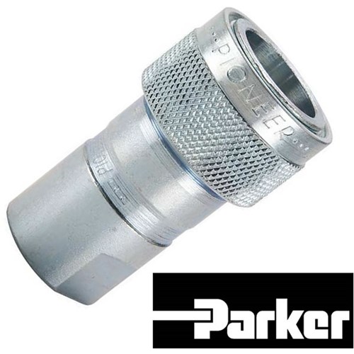 Parker 4000 series general purpose hydraulic quick coupling. Protective zinc plating. Rated flow 50 USGPM and 3000 PSI. Nitrile seals. Manual sleeve with poppet valve.