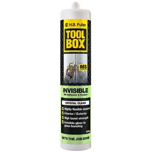 Tool Box™ Invisible is a clear multi-purpose hybrid polymer adhesive and sealant with outstanding clarity. Tool Box™ Invisible is ideal for creating invisible seals and for bonding a wide variety of materials to create a durable, high strength, waterproof bond-line.