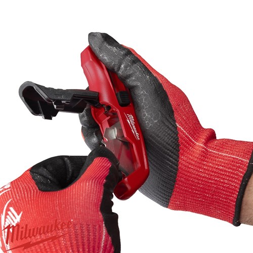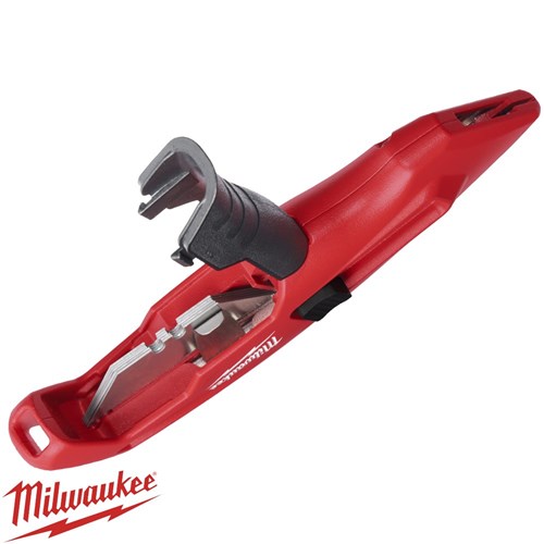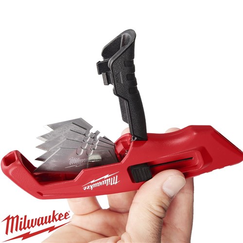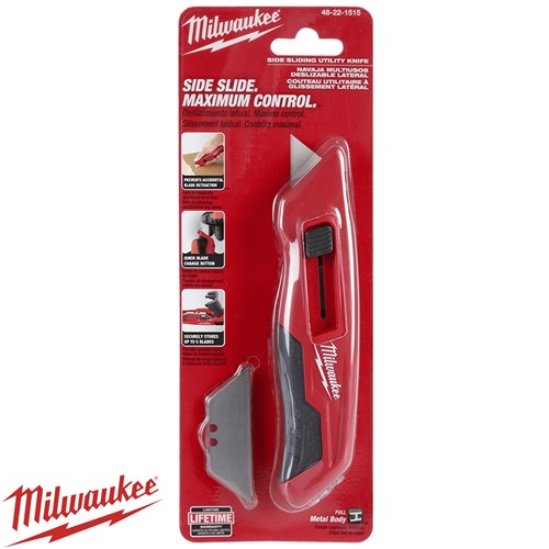 The Side Slide Utility Knife offers precise control and safety with its side slide button, minimizing accidental blade activation. Its durable metal body includes onboard storage for up to 5 extra blades, ensuring uninterrupted work. The ergonomic over-mould grips enhance comfort and reduce hand slippage. With a quick-release button for tool-free blade changes and tether-ready design, it's a versatile and efficient tool for any job site.