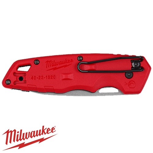 The Milwaukee Fastback Folding Knife features a press and flip mechanism for one handed opening, a sharp stainless steel drop, liner lock for easy closure and a durable belt clip.