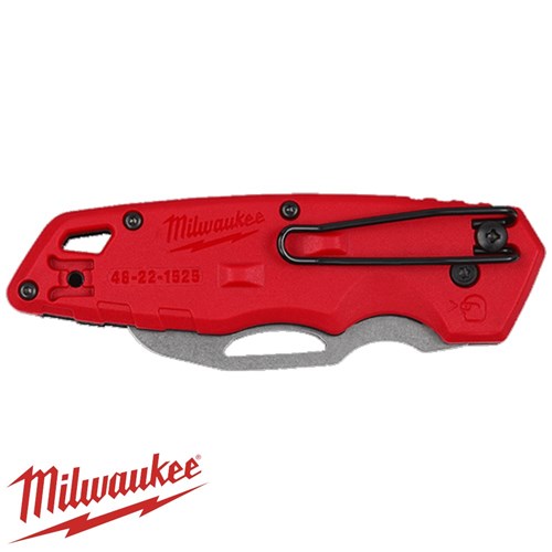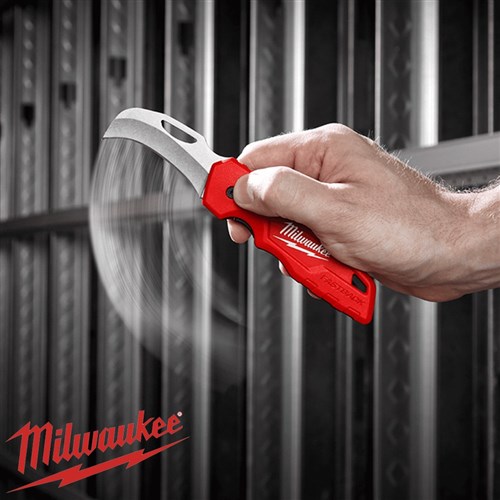 The Milwaukee Fastback Hawkbill Folding Flip Knife features a press and flip mechanism for one handed opening, a sharp stainless steel hawkbill blade, liner lock for easy closure and a durable belt clip.