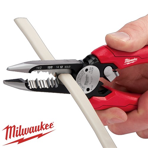 The Milwaukee 6 in 1 Combination Pliers for Non Metallic materials are designed to smooth out rough edges, create clean cuts, and to strip NM wire and bolts. Featuring a one handed swing lock allowing users to open one handed, the Combination Pliers are also made with increased anti rust protection.