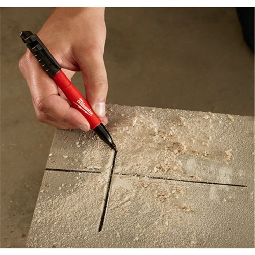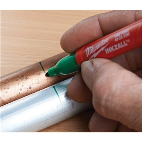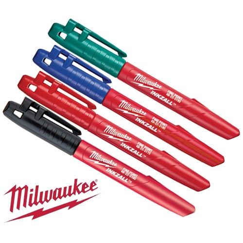 Milwaukee INKZALL Coloured Fine Point Markers, Pack of 4. These jobsite markers feature clog resistant tips and the ability to write through dusty, wet or oily surfaces. The durable marker tips are designed for writing on rough surfaces such as OSB, cinder block and concrete and the ink dries quickly to reduce smearing markings, without drying out quickly when the cap is left off. For added user convenience these markers have a built-in hard hat clip for easy storage and access. Comes with 1 each of Black, Blue, Green and Red Markers.