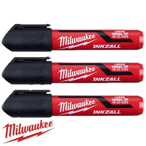 The Milwaukee Three Piece Inkzall Black Large Chisel Tip Markers are designed with clog resistant tips to write through all dusty, wet or oily surfaces.