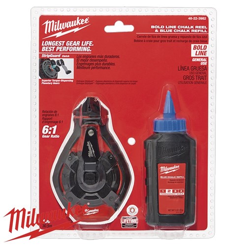 The Milwaukee 30m Bold Line Chalk Reel Kit features high performing chalk which produces a clear, bold, abrasion resistant line with a quick 6:1 retraction ratio. The rubber handle also provides users with extreme comfort.