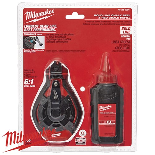The Milwaukee 30m Bold Line Chalk Reel Kit features high performing chalk which produces a clear, bold, abrasion resistant line with a quick 6:1 retraction ratio. The rubber handle also provides users with extreme comfort.