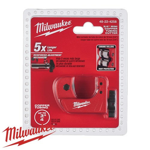 The Milwaukee Mini Copper Tubing Cutter 19mm (3/4”) features a proprietary adjustment mechanism with a chrome roller and easy to grip knob. The durable cutter is engineered for longevity, with rust protection technology.