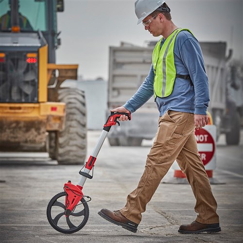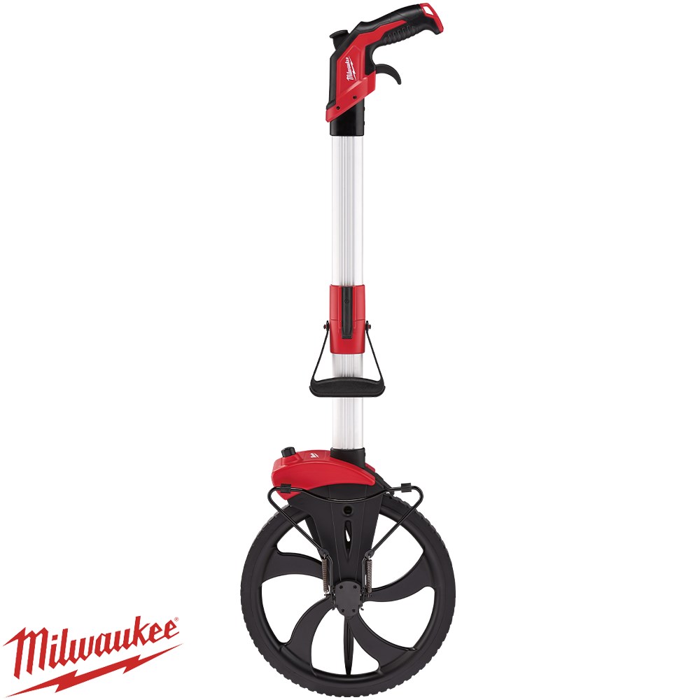 The MILWAUKEE 305mm (12”) Measuring Wheel is built for extreme durability and enhanced ergonomics. Constructed with reinforced aluminium frames and folding joints, it withstands tough jobsite conditions. The wheel features a Debris-Cleaning Wheel Flap to prevent dirt and grime build-up, ensuring smooth operation. It includes a reinforced kickstand for stability and a top handle clearing function for easy use without bending over. The pistol grip handles are designed for ergonomic comfort, similar to power tool handles, and feature a top brake function to lock the wheel and reading for increased accuracy. The measuring wheel has a diameter of 305mm (12”), measures up to 999m, and collapses to 59cm for convenient transportation and storage.