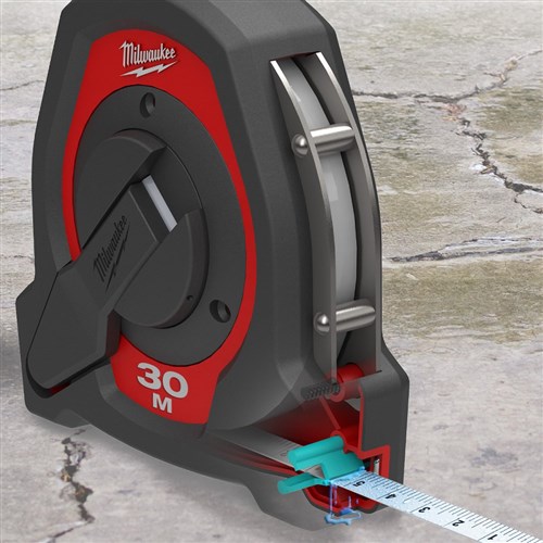 MILWAUKEE Closed Reel Long Tapes are designed for exceptional durability and accuracy. They feature nylon-coated steel blades with minimal stretch, ensuring precise measurements. The industry-first Grime Guard blade wiper prevents dirt, dust, and debris from causing jams. Reinforced 3:1 planetary gears and a heavy-duty metal frame provide unmatched durability, even in the toughest jobsite conditions. The tape includes a 100ft folding hook for added convenience.