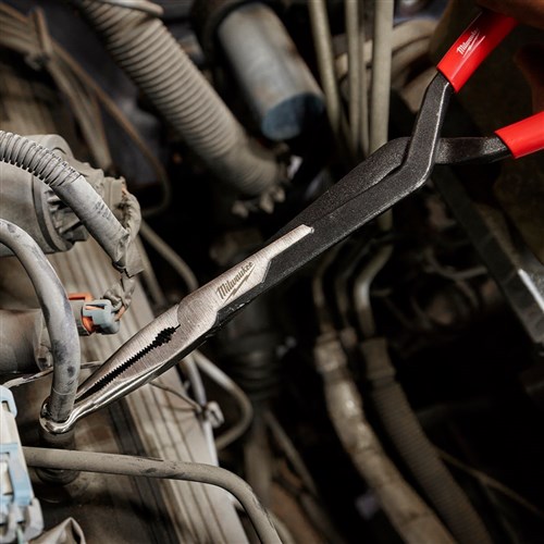 The Milwaukee 13" Long Reach Hose Grip Pliers Set offers exceptional access and grip force for handling hoses and other materials. The set includes pliers with 8mm, 12mm, and 19mm grip sizes. Featuring a Deep-Reach Cross Handle design, these pliers provide a wide jaw opening and a slim profile for extended reach in tight spaces. The single-joint design ensures maximum gripping force and precise control. Multi-function gripping zones accommodate various applications, including hoses and fasteners. The pliers are coated with corrosion-resistant black oxide for enhanced durability and feature slip-resistant grips for improved leverage. Made from forged alloy steel, they are backed by a limited lifetime warranty.