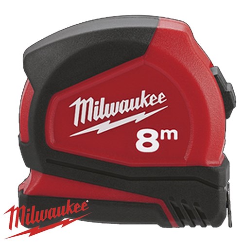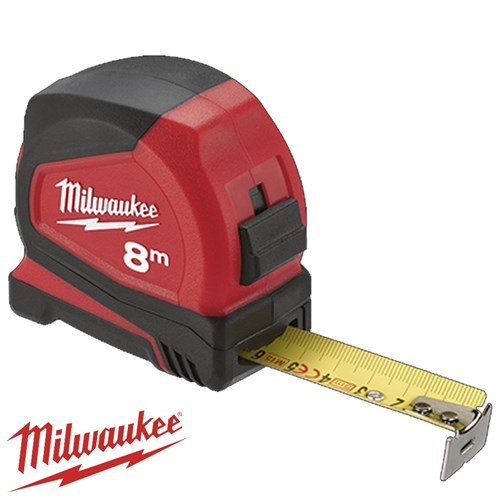 The Milwaukee 8M Compact Tape Measure features a 2.7m standout, heavy duty nylon bond blade protection and a 5 point reinforced frame to provide the utmost durability in measuring tools. The compact body is designed for convenience, with a lanyard and hook for storage.