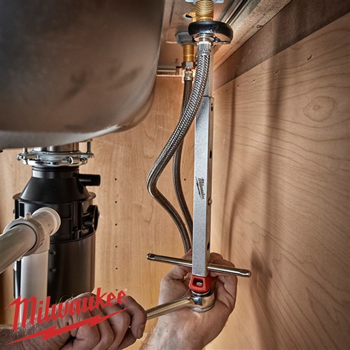 The Milwaukee Basin Wrench 32mm (1.25”) has been designed to support easy basin swap outs in under sink applications. Featuring a forged spring loaded jaw, ergonomic handle, screwdriver hole design and a ratchet ready handle.