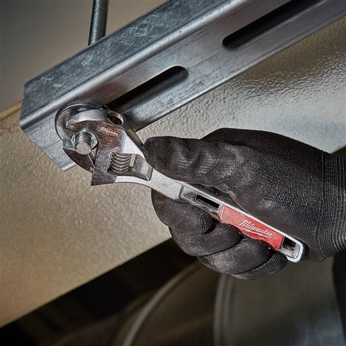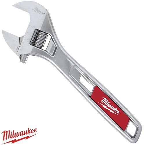 The Milwaukee 150mm (6”) Adjustable Wrench is engineered to enhance productivity for professional users. It features a proprietary adjustment screw that ensures the jaws remain securely in place. The ergonomic handle is designed for optimal comfort and won’t dig into your palms, while its chrome plating provides rust protection and extends the tool’s lifespan. The wrench’s parallel jaw design prevents slipping and avoids damaging finished surfaces. Additionally, a tether-ready handle loop makes it ideal for the toughest job sites. Milwaukee backs this product with a Limited Lifetime Warranty on all adjustable wrenches.