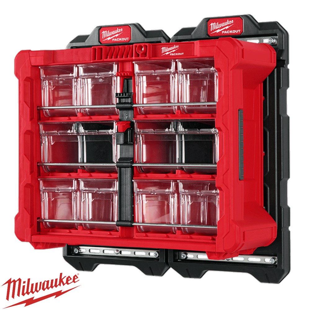 The Milwaukee PACKOUT™ Tilt Bin Organiser is a versatile storage solution designed to keep small tools, parts, and accessories organised and easily accessible. Part of the PACKOUT™ Modular Storage System, it features ten removable quick-access bins (2 large, 8 small) with dividers and labels included for efficient organisation. The impact-resistant polymer body allows the organiser to securely stack or hang with other PACKOUT™ components, while stainless steel locking bars keep bins firmly closed during transport. Ideal for workshops, job sites, or hobby spaces.