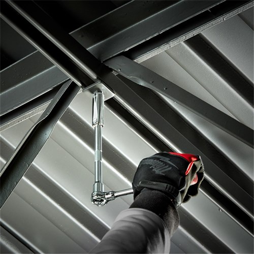This 12 piece 3/8” Drive Ratchet Set delivers ultimate versatility and access. The slim-profile ratchet features a pivoting head that can be used as a ratchet, a nut driver, or any angle in between. MILWAUKEE’s proprietary sockets feature a parallel flat design for wrench compatibility and to deter rolling. Socket sizes are stamped into the flats for improved visibility. The kit is stored in a soft-sided carrying case that includes a socket rail to keep sockets and accessories organised, both on and off the job site.