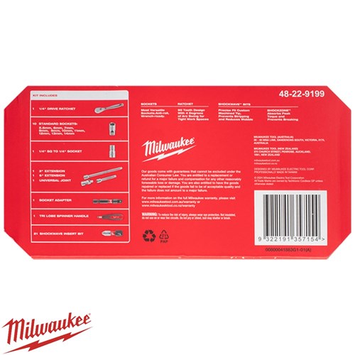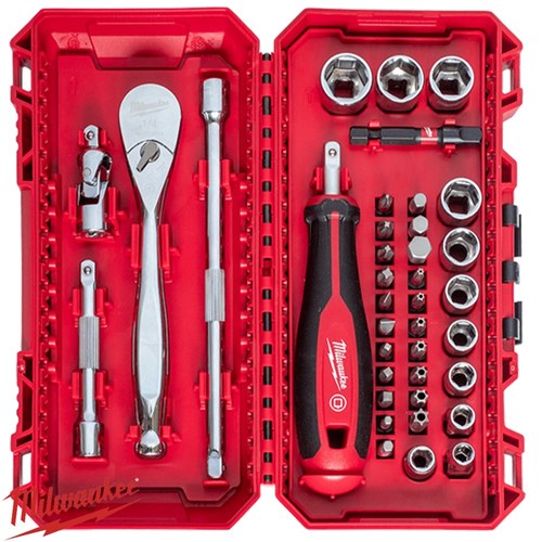 The MILWAUKEE 38-Piece 1/4" Drive Metric Ratchet & Socket Set is crafted to provide the ultimate versatility for professionals. Featuring innovative FOUR FLAT Sides, these sockets are both anti-roll and wrench-ready, ensuring stability and ease of use. The 90-tooth ratchet delivers a precise 4° arc swing, making it perfect for tight, confined spaces, whether you're working under the hood or in a remodelling project. Each socket is clearly stamped with metric measurements on the flat sides for easy identification. The set is housed in a durable carrying case, offering exceptional portability, and includes all the accessories needed to tackle any task, whether in the garage or on the job site.