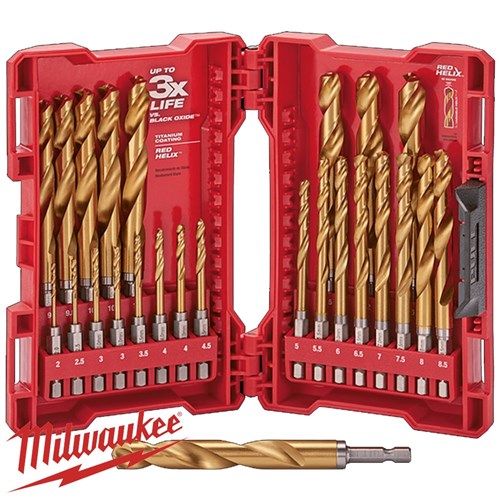 The Milwaukee Shockwave Red Helix 25 Piece Titanium Drill Bit Set are designed with 135 degree split point tips to engage faster starts, variable helix for clean material removal and a chip breaker feature for cooling the drilled material.