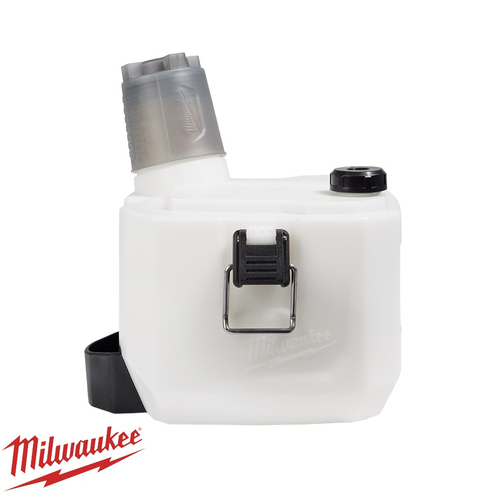 The 4-Litre Handheld Chemical Sprayer Tank is designed to be compatible with the Milwaukee M12™ Handheld Chemical Sprayer Powered Sprayer Head (sold separately). This tank features an onboard measuring cup, a strainer for debris filtration, and an intake hose. Its translucent walls make it easy to monitor liquid levels, while the metal latches and sturdy, square design ensure durability.