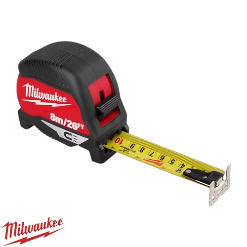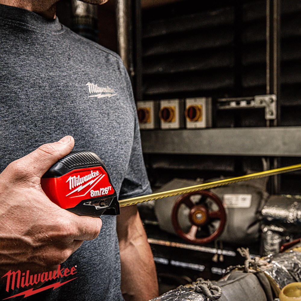 The Milwaukee 8M / 26FT Compact Magnetic Tape Measure combines durability, versatility, and convenience for jobsite use. Featuring a magnetic hook for secure attachment to EMT and steel studs, it offers up to 4.5m of standout for extended reach. The nylon blade with anti-tear coating on the first 150mm, dual Imperial and Metric printing, and a reinforced 5-point impact-resistant frame ensure long-lasting performance and reliable measurements.