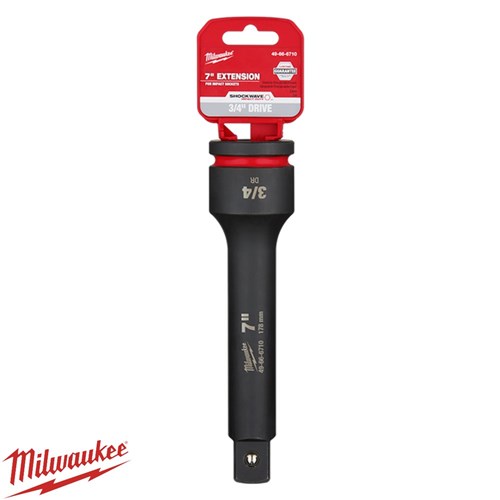 Tackle tough jobs with confidence using the MILWAUKEE SHOCKWAVE™ 3/4" Drive 178mm (7") Impact Socket Extension, engineered for maximum durability and access in high torque applications. Built from forged impact steel, this extension delivers superior strength and shock resistance, making it ideal for professional use. The dual-hole design and ring groove enable quick and secure attachment, while ball detent retention ensures sockets stay locked in place. With laser-etched and ink-filled size markings, identification is quick and easy—even after heavy use. Designed to meet ASME industry standards and backed by Milwaukee’s Lifetime Guarantee, this is the extension that won’t let you down.