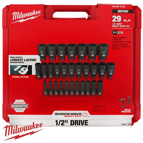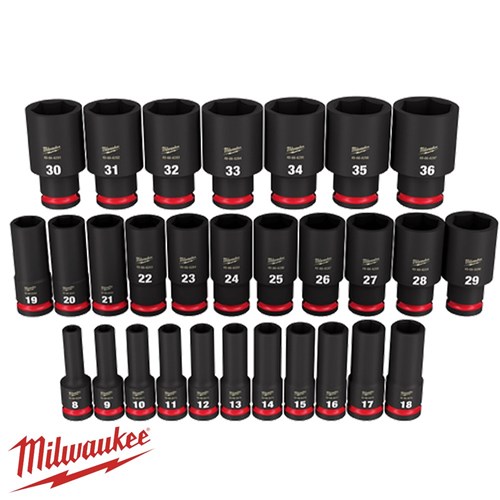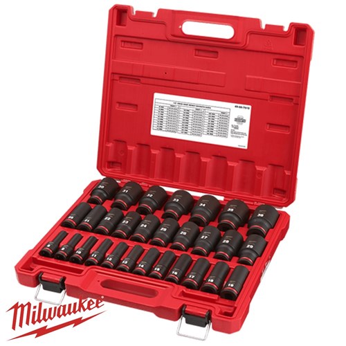 The MILWAUKEE® 29 Piece SHOCKWAVE Impact Duty™ 1/2" Drive Deep Socket Set features the boldest, longest-lasting markings and extreme impact durability in high torque applications. The stamped and ink-filled size markings make it easy to select the right socket every time throughout the life of the socket. Engineered with high strength forged steel for optimised performance in heavy-duty applications, and a non-slip hex geometry prevents fastener rounding. The dual-hole design and ring groove allow for easy socket attachment and removal. All SHOCKWAVE Impact Duty™ Sockets are backed by a Lifetime Guarantee and meet ASME industry standards.