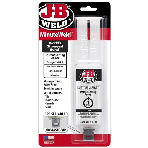 MinuteWeld is a special formulated, high-strength, two-part instant setting epoxy. MinuteWeldâ?¢ will set under most temperature conditions in one minute. MinuteWeld is designed to adhere to multiple surfaces and can be used on ceramic, tile, glass, stone, most plastics, wood and metal.