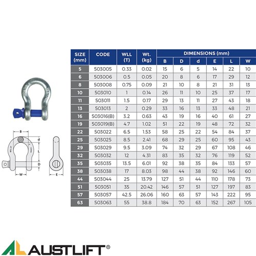 Austlift blue screw pin bow shackles are designed for demanding lifting applications, providing secure connections for chains, wire ropes, and other rated fittings. Ideal for use across marine, agricultural, mining, and engineering industries, these shackles conform to AS2741 standards and are manufactured from Grade S material.