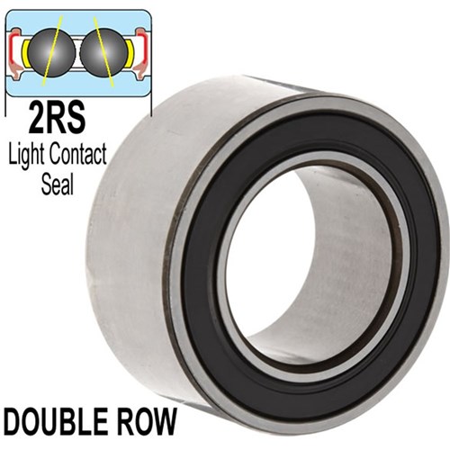 This is basically a back-to-back mounting of two single-row angular contact ball bearings, but their inner and outer rings are each integrated into one. Axial loads in both directions can be sustained, and the capacity to sustain moments is good. This type is used as fixed-end bearings. Their cages are pressed steel. Supplied with 2RS light contact seals for good resistance to bearing contamination.
