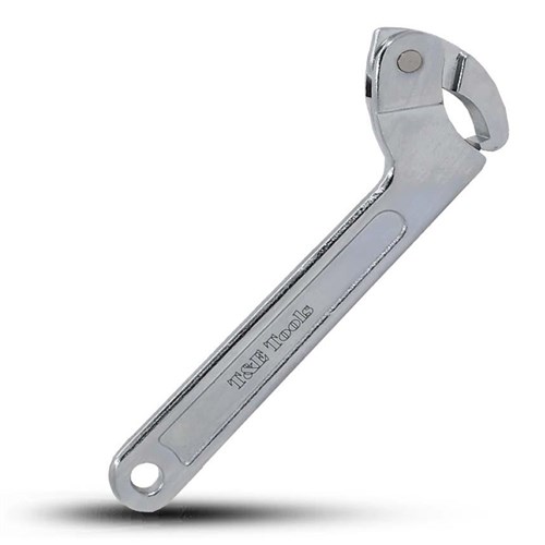 T&E Tools Adjustable "C" Type Hook Wrenches feature a fully adjustable pivoting jaw, ideal for use on castellated nuts on hydraulic equipment and other machinery. These wrenches are drop forged, fully heat-treated, and crafted from high-grade alloy steel for enhanced durability and performance.