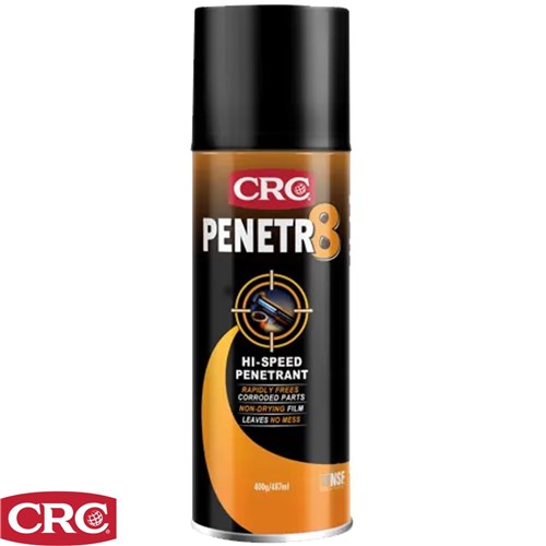 CRC Penetr8 is a robust industrial-grade lubricant and penetrant with low viscosity, specifically crafted to swiftly release seized, bound, or frozen fasteners. This high-performance formula rapidly infiltrates rust, scale, gum, grease, and corrosion, boasting a low surface tension that effortlessly seeps into cracks, seams, threads, and joints with exceptional efficiency. Employing CRC Penetr8 facilitates the hassle-free disassembly of plant machinery, tools, and equipment, streamlining both routine maintenance and emergency repairs.