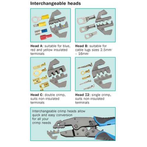 Ideal for the tradesman, auto electrician, motor mechanic or handyman this crimping kit features 4 interchangeable heads allowing one tool to service all your crimping needs from insulated and non-insulated terminals through to cable lugs. The heavy-duty ratchet action and spring release is easy to use and provides a high quality crimp.