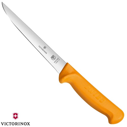 The Victorinox Swibo range of knives are used by professional chefs, butchers and fisherman around the world giving testament to the quality, functionality and longevity of the collection. Made in Switzerland, the steel blend produces a high-quality tempered, stamped blade that is resistant to wear and corrosion with a 55-58 Rockwell hardness. The signature bright yellow, synthetic handles are made with non-porous Swiss polyamide which is injection moulded and sealed onto a polished, high-grade stainless steel blade. This eliminates gapping between the blade and handle assuring the handle is hygienically and permanently sealed to the blade.