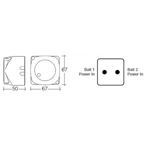 Automatically connects and disconnects an appliance or circuit at the preset input voltage. Ideal for dual battery systems or to switch high current appliances. Features surge protection, L.E.D indicator, silver tipped contacts for durability and efficiency, with a weatherproof body (IP65). Cut-in: 13.3V Cut-out: 12.7V (5 second delay) 160A at 12V for 60 seconds 140A at 12V continuous load maximum