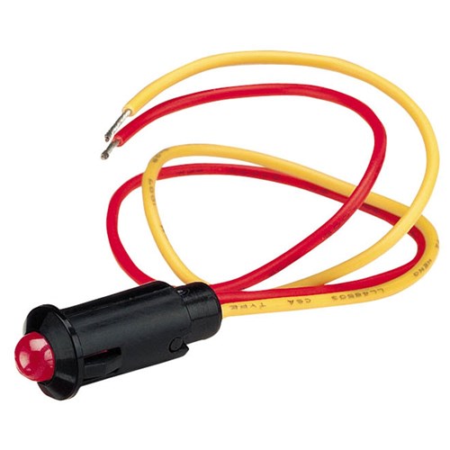 12 Volt Pilot Lamp Pre-wired with Red L.E.D. Push-fit design, pre-wired with 180mm leads. Mounting opening 8.2mm dia.