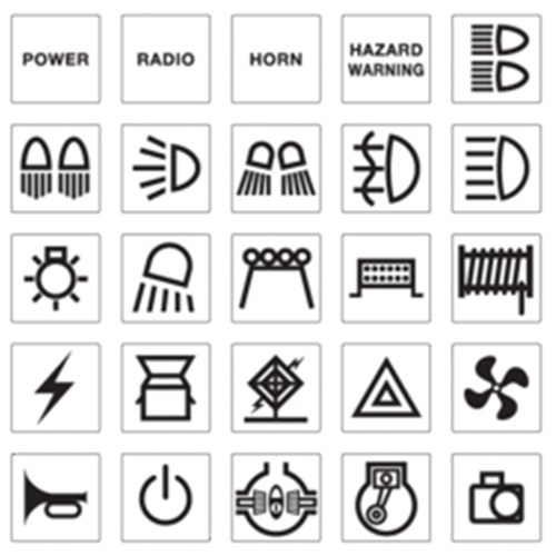 Select from 50 popular 4WD symbols (black) to customise your L.E.D illuminated switch actuatorIncludes symbols (pictured) & descriptions: off-road lights, backup lights, driving lights, work lights, fog lights, spot lights, rock lights, aux lights, map light, roof lights, LED light bar, Aux 1, 2 & 3, air compressor, 12V, fridge, front & rear diff lock, reverse camera, start, fan, winch, power, radio, horn, hazard warning