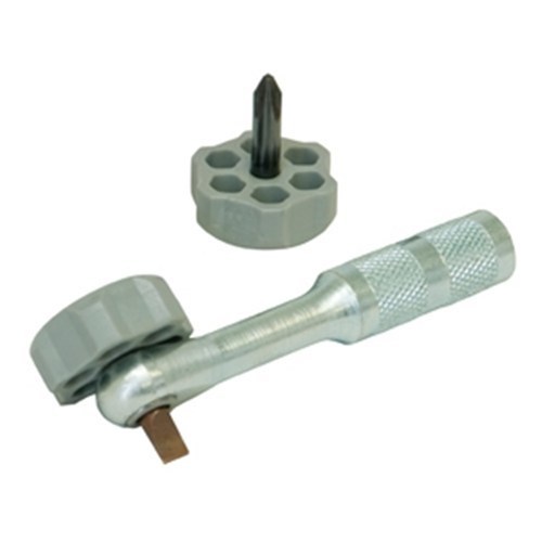 LIsle right angle ratcheting screwdriver. Place handle over the bit and turn. Reverse handle on bit to tighten. Can also be used with 1/4" round shaft screwdriver. Ratcheting action with infinite settings. Includes straight slot and #2 Phillips bit assemblies.