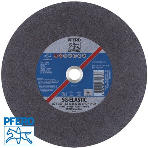 Pferd SG-ELASTIC INOX Cutting disc. Cutting disc for use on popular portable cutting machines 80 m/s 2.8mm thickness for universal cutting work. Flat disc type with no ferrous, sulphurous or chlorinated fillers. 350mm x 2.48m x 22.2mm