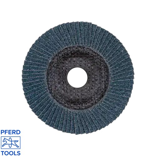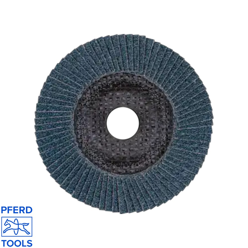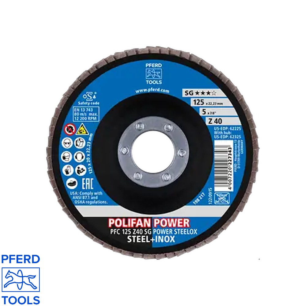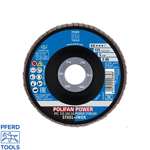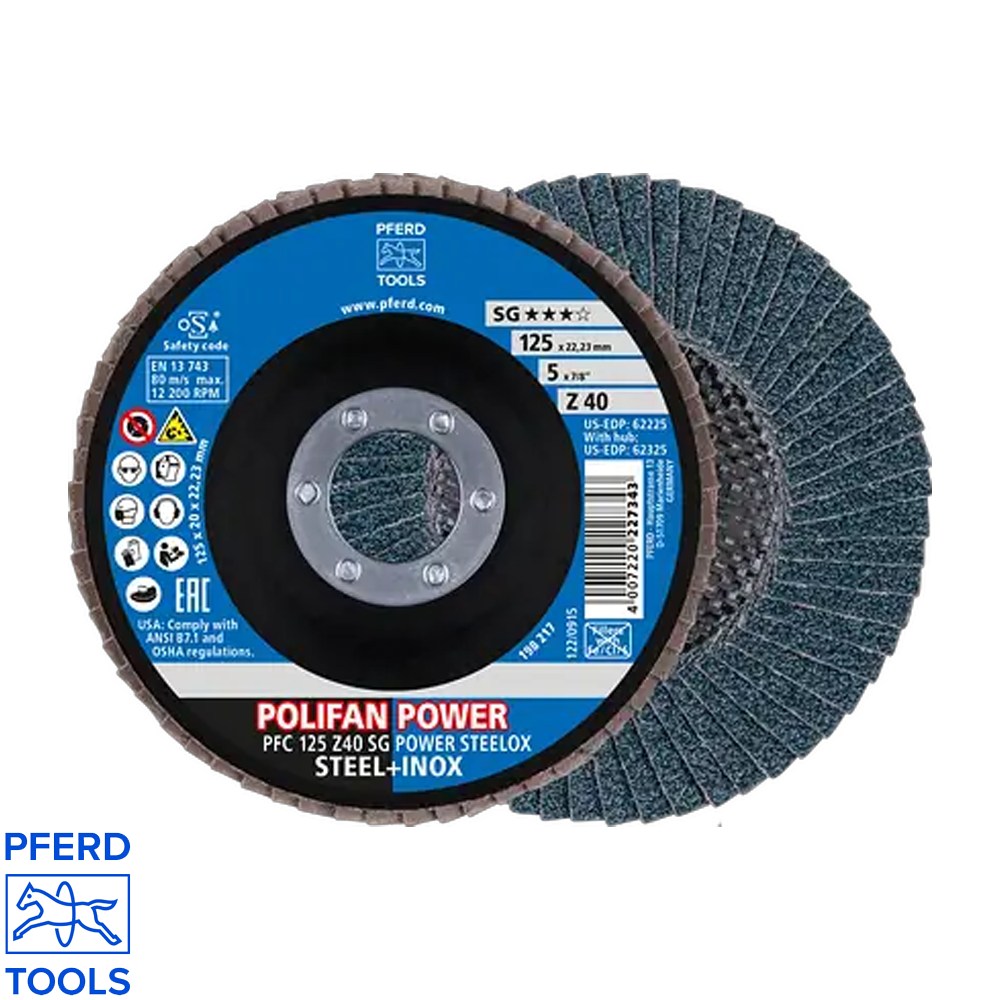 - Flap disc type: POLIFAN PFC 125 Z40 SG STEELOX (conical)