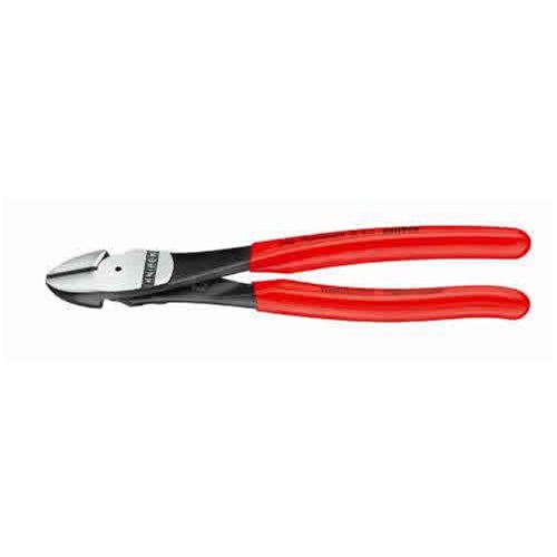 Knipex 200mm (8") high leverage diagonal cutters require little effort due to proper coordination of cutting edge angle, leverage ratio, and handle shape. Forged-on axle for heaviest duty. Suitable for all types of wire including piano wire. High cutting performance with minimum effort due to optimum coordination of the cutting edge angle, transmission ratio and ergonomic handle shape. Precision cutting edges additionally hardened, cutting edge hardness approx. 64 HRC.Cuts 4.2mm Nails and Medium Hard Wire, 3mm Hard Wire and 2.5mm Piano Wire. Made in Germany.