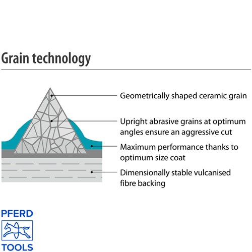 Push grinding performance to the next level with the PFERD ACTIROX AF799 Resin Fibre Discs. Designed for extreme stock removal on steel and stainless (INOX) steel, these 5" ceramic fibre discs feature geometrically shaped abrasive grains that deliver aggressive, high-speed grinding with minimal pressure. The upright grain orientation and dimensionally stable vulcanised fibre backing enhance cutting efficiency and disc life. For best results, pair with a H-GT backing pad.